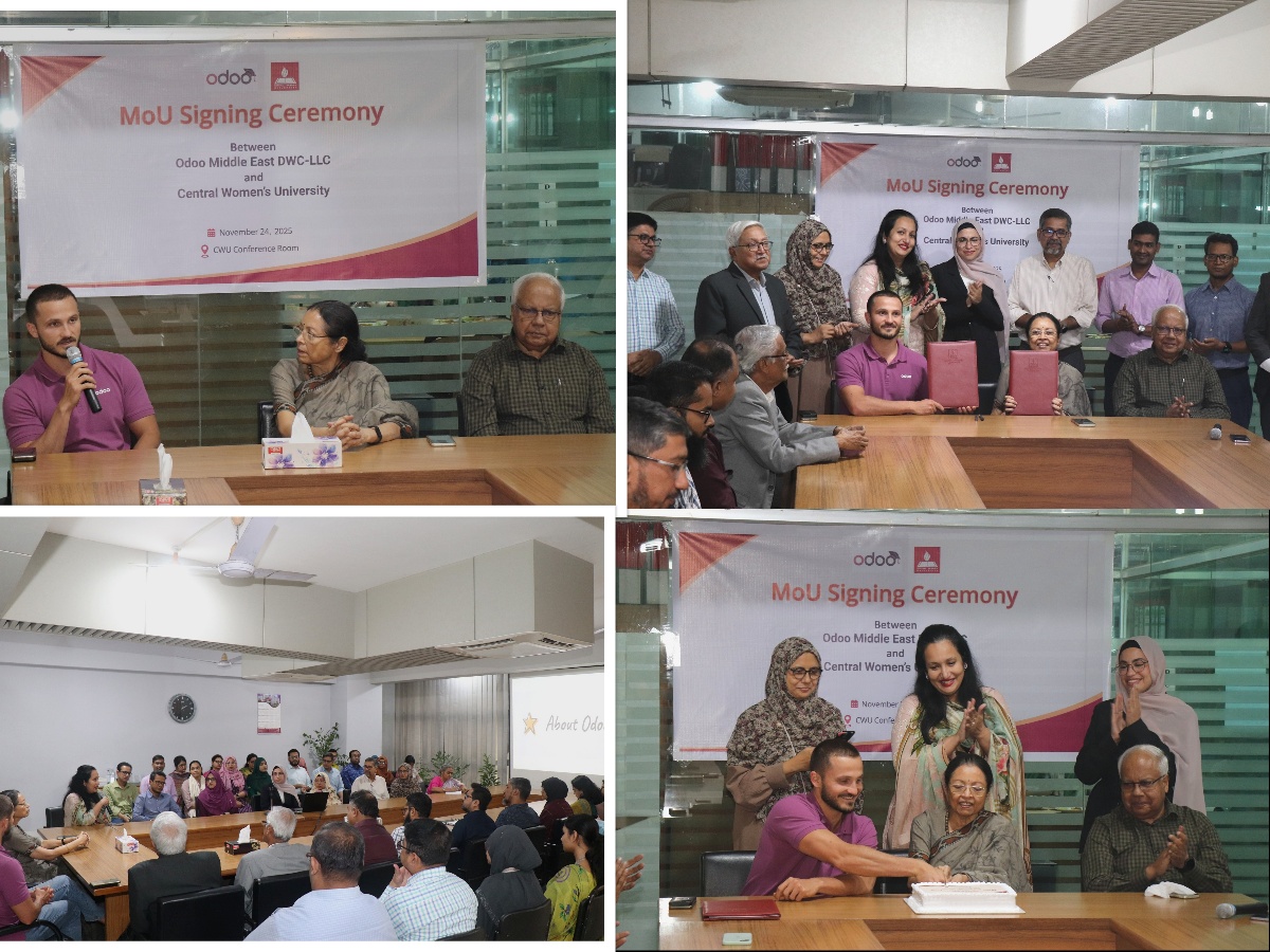 On 24 November 2025, Central Women’s University (CWU) signed a Memorandum of Understanding (MoU) with Odoo Middle East DWC-LLC, a globally recognized provider of open-source business applications, to enhance academic and professional skill development opportunities for students and faculty. The MoU was formally signed by Dr. Perween Hasan on behalf of Central Women’s University and Kevin Farah on behalf of Odoo Middle East DWC-LLC. The event was attended by CWU Treasurer Dr. Ahmed Abdullah Jamal, Registrar Elias Ahmed, departmental Chairpersons, and faculty members, showing strong university support for the partnership. Representatives from the Odoo Team and Sysnova Team were also present, contributing insights into the educational initiatives of the collaboration. A number of CWU students participated in the program, showing keen interest in the learning and career opportunities offered through the MoU. Through this collaboration, Odoo will offer CWU free access to unlimited educational databases, workshops, seminars, and training sessions for both students and faculty. CWU will also receive access to Odoo Academy’s learning materials and the “Odoo Course” for practical ERP training. Students will further benefit from Odoo’s Class to Career program, creating opportunities for future employment. All these facilities will be provided at no cost, enhancing students’ digital and professional skills. This collaboration strengthens CWU’s commitment to advancing technology-based education and preparing students for future career opportunities.